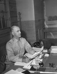 General Fred L. Walker, commander at Camp Bowie, shown at his desk. He is wearing his military uniform and is holding sheets of paper. On the desk are several sheets of paper, a telephone, a radio and miscellaneous office supplies.