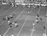 The Red River Shootout game between the University of Oklahoma and the University of Texas is being held at the Cotton Bowl in Dallas, Texas. The rivalry began in 1900 and has been running since. During the second quarter of the game, Sooners quarterback Eddie Davis (extreme left) threw a pass downfield. The pass was intended for his teammate Joe Golding (30). Longhorn back, Walter Heap (20) jumped the route and intercepted the ball near the fifty yard line. Heap managed to return the ball to the Oklahoma 35. The Longhorns won the game 40-7. Published in the Fort Worth Star-Telegram evening edition, October 13, 1941.