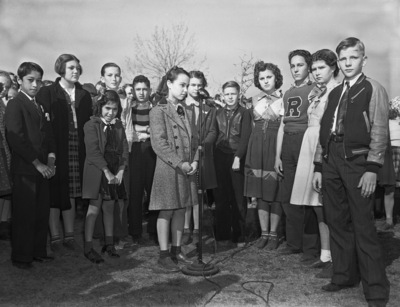 Twelve students from six South Side schools took part in an Arbor Day Tree Planting Rites in Rosemont Park. At the microphone is Dolores Gant of George Clarke School. In the semi-circle are (left to right) Ciprino Dominguez, Joyce Hancock, Lupe Gallegos, Harry Miller, Johnnie Dieb, Mary Maurice McCarty, Maurice Bradford, Mary Jo Lambert, Odell Southerland, Claudia Hathcock, and Eric Hansen. Published in the Fort Worth Star-Telegram morning edition, February 22, 1940.