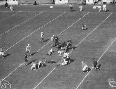 The Red River Shootout game between the University of Oklahoma and the University of Texas is being held at the Cotton Bowl in Dallas, Texas. The rivalry began in 1900 and has been running since. The Longhorns' second touchdown came off a 74-yard drive in the first quarter. Pictured is one of the first down plays that kept the drive alive. Longhorn fullback Pete Layden (31), faked to teammate Jack Crain (44), and is charging over the middle of the Sooner line for three yards to move the chains. Sooner Roger Eason is making the tackle. The Longhorns won the game 40-7. Published in the Fort Worth Star-Telegram evening edition, October 13, 1941.