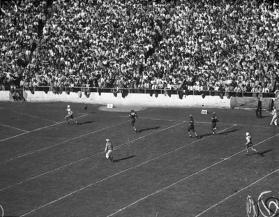 The Red River Shootout game between the University of Oklahoma and the University of Texas is being held at the Cotton Bowl in Dallas, Texas. The rivalry began in 1900 and has been running since. The 1941 contest is all Longhorns early and the Sooners found their offense difficult to stop. In the second quarter the Longhorns went seventy-one yards on one play to extend the lead to 21-0. Fullback Pete Layden faked a hand-off to Jack Crain and then ran straight over the middle for sixteen yards. Just before being wrapped-up in a tackle, Layden lateraled to End Malcolm Kutner. Kutner stripped away tackles from Sooner pursuers and ran the ball fifty-five yards for the touchdown. He is pictured moments before crossing the goal line. The Longhorns went on to win the game 40-7. Published in the Fort Worth Star-Telegram morning edition, October 13, 1941.