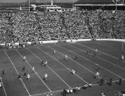 The Red River Shootout game between the University of Oklahoma and the University of Texas is being held at the Cotton Bowl in Dallas, Texas. The rivalry began in 1900 and has been running since. The 1941 contest is all Longhorns, beginning with this play on the opening drive. Fullback Jack Crain, 44, is shown running downfield and dropping behind the Sooner defense. Pete Layden (not pictured) spotted the open back and threw a deep pass downfield. Crain caught the pass in the end-zone for the first score of the game. Also pictured is Longhorn Preston Flanagan, 87, and Sooner Orville Mathews, 35. The Longhorns went on to win 40-7. Published in the Fort Worth Star-Telegram morning edition, October 13, 1941.