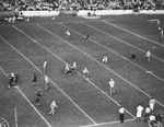 The Red River Shootout game between the University of Oklahoma and the University of Texas is being held at the Cotton Bowl in Dallas, Texas. The rivalry began in 1900 and has been running since. The 1941 contest is all Longhorns despite an injury to their quarterback Pete Layden. R. L. Harkins came into the game in the third quarter, replacing the injured quarterback. Harkins faked to fullback Jack Crain, 44, before throwing an eighteen yard touchdown pass to end Noble Doss, 11. Doss out-maneuvered Sooner defender Jack Jacobs (27) before fielding the throw and scoring the Longhorn's fifth touchdown. Harkins is show at the far left, being swarmed by three late-arriving Sooner defenders. The Longhorns went on to win the game 40-7. Published in the Fort Worth Star-Telegram morning edition, October 13, 1941.