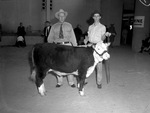 Some baby beeves caught the eye of the Chuck Wagon Gossiper at the Texas State Fair at Dallas. The second prize lightweight baby beef is shown here. This winning beef is pictured with T. H. Roensch (left), county agent at Roby, and Marion Hughey who fed the animal. The young feeder is the son of Mr. and Mrs. Tom Hughey of Roby, Texas. The animal was bred on the Y-6 Ranch owned by Mrs. Fay Young Morton. Published in the Fort Worth Star-Telegram morning edition, October 16, 1941.
