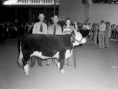 Some baby beeves caught the eye of the Chuck Wagon Gossiper at the Texas State Fair at Dallas. The champion Hereford steer in the open classes at Dallas is shown with (left to right) Frank Newsom, county agent of Mason County, Texas; M. W. Kothmann and his daughter, Merlyn Gale Kothmann of Mason, Texas who fed the steer and takes down the very considerable awards won by the 1, 140-pound animal. Published in the Fort Worth Star-Telegram morning edition, October 16, 1941.