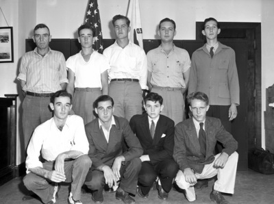 Coast Guard. Boys sent to naval training school. Left to right, kneeling, Titus E. Oxley, Raymond E. Priess, Marvin W. Traver and John Earl Lamb. Standing Eliphlet B. Fogelman, Robert K. Spessard, Jack Bicknell, Stanley W. Owens and Ralph E. Cooper.