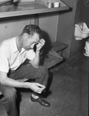 Marion Miley, a nationally known golf star, and her mother, Mrs. Fred Miley, were killed on September 28, 1941. They were staying at the Lexington Country Club in Lexington, Kentucky, when the robbery-homicide occurred. Mrs. Miley lived long enough to describe the attack and give the police a description of the suspects. Two weeks after the initial crime, Fort Worth Police detectives were following a lead on another case when they saw a two-toned Buick with Kentucky plates. On a hunch, the detectives brought the driver and suspect, Tom Penney, in for questioning. Mr. Penney is shown sitting in a solitary confinement cell in Fort Worth, Texas, after confessing to the crime. He admitted to being one of three murderers and the trigger-man.