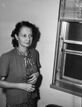 Marion Miley, a nationally known golf star, and her mother, Mrs. Fred Miley, were killed on September 28, 1941. They were staying at the Lexington Country Club in Lexington, Kentucky, when the robbery-homicide occurred. Mrs. Miley lived long enough to describe the attack and give the police a description of the suspects. Two weeks after the initial crime, Fort Worth Police detectives were following a lead on another case when they saw a two-toned Buick with Kentucky plates. On a hunch, the detectives brought the driver and suspect, Tom Penney, in for questioning. Miss Wilma Williams, 28, was accompanying Penney and two other men. She traveled with them to Fort Worth, Texas. from Jackson, Mississippi. The police cleared Miss Williams of any connection with the murders, but credited her story with helping "break" the case. Miss Williams is shown standing by a window. She is wearing a paisley dress and a sweater.