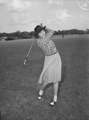 The River Crest Country Club in Fort Worth, Texas, is hosting the Texas Women's Open. As a preliminary feature, the club is holding a mixed doubles golf match. Practicing on the driving range before the event is amateur Miss Mary Agnes Wall. She is shown in the follow-through of her swing after hitting an iron. She is dressed in a hat, plaid button-up blouse, and a skirt.