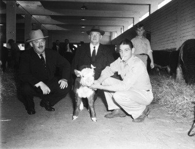 Some attendees of State Fair at Dallas, Texas are pictured here. They are: Paul Colbert, Wichita Falls, Texas (left), W. L. Colbert, Oklahoma City, Oklahoma (rear) and at the right Frank Taggart, herdsman for Colbert Hereford Ranch, Mill Creek, Oklahoma, shown with young calf. All men are crouched on the floor near the calf. Both Mr. P Colbert and Mr. W. L. Colbert are wearing suits, ties and hats. Mr. Taggart is wearing trousers, full sleeves shirt, and holding the calf and smoking a cigarette.