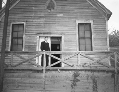 Reverend Lee Heaton, rector of Trinity Episcopal Church, shown at the door of the old parish house, built in 1895, which is to be razed to provide lumber for erection of a community center. Reverend Heaton is wearing a suit and is holding on to the house's front railing. The front of the building has two tall windows, one on either side of the door.