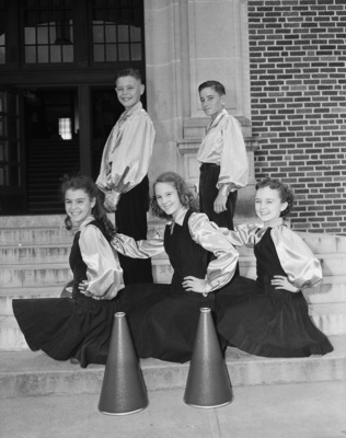 J. P. Elder Junior High School yell leaders. Left to right, front row, Jean Britt, Mary Elizabeth Tomlinson and Charlotte Jean Swart. Back row, Jack Britt, left, and Boyd Elder.