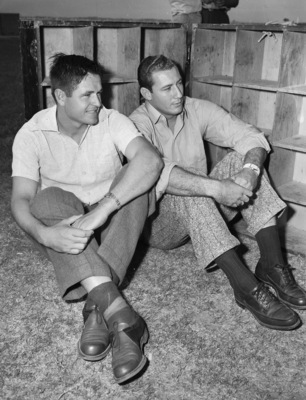 The Texas Christian University football team will be short-handed Saturday against the Texas A&M Aggies. Left to right are injured players Billy Blackstone and Gus Bierman. They are sitting on the ground, not in uniform, as they watch their teammates practice. Blackstone is wearing a collared shirt and trousers. Bierman is dressed in a button-up shirt and striped trousers. Published in the Fort Worth Star-Telegram morning edition, October 15, 1941.