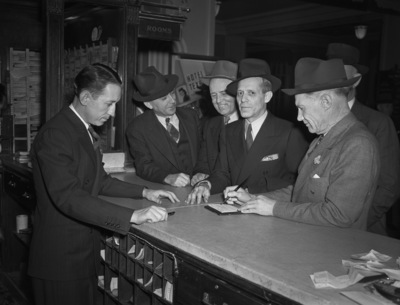The annual district meeting of the Texas Bankers Association is being held at the Hotel Texas. Four bankers are checking into the hotel with B. Stroud, the room clerk on the far left. The bankers left to right are D. A. Holman, George Plants, De Lea Vicars, and C. E. McCutcheon. Mr. is cashier of the Farmers National Bank in Seymour, Texas. He is wearing a hat and a three piece suit. Mr. Plants is president of the First National Bank in Seymour, Texas. He is dressed in a hat and a double breasted suit. Mr. Vicars is president of the First National Bank in Pampa, Texas. Mr. McCutcheon is vice president of the First National Bank in Wichita Falls, Texas. He is dressed in a hat and a light colored suit. Mr. Stroud is standing behind the check-in desk. He is wearing a double breasted pinstripe suit. Published in the Fort Worth Star-Telegram morning edition, February 22, 1940.