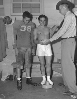 Masonic Home football: Vester Villines, center, Mason on scales, Coach Rusty Russell, Cecil Mosely at left