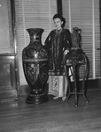 Some of the household treasures to be seen at the antique show at the Woman's Club. Mrs. Paul Baker is dressed in a Chinese costume as she stands next to some rare Chinese antiques. On the left is a large tall vase with intricate design and on the other side is a warrior figurine on an ornately carved stand (right). Published in the Fort Worth Star-Telegram evening edition, October 17, 1941.