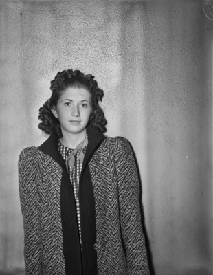 Billyelu Henderson representing Polytechnic High School is to speak on art. She is standing in front of a wall with a big long coat on, a ribbon band hanging from her neck and a square padded shirt on the inside. She has her hair in curls. Image appeared in Star-Telegram "Students will Speak on Art," Star-Telegram Evening Edition February 23, 1940.