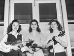 Violin trio, left to right, Dorothy Ritchie, Pauline Snyder and Ellen Ayers Rice, seen side by side. The women are smiling and presenting their violins. The violin trio, pupils of Mr. Brooks Morris, will play Friday night at the fortieth anniversary program of the Fort Wort Public Library.