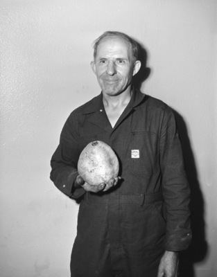 It's a sweet potato, not a pumpkin. It was grown in the home garden of Monroe Masten. Monroe Masten holding a sweet potato. It measures 17 inches around and weighs 3.5 pounds. Published in The Fort Worth Star-Telegram Evening Edition October 16, 1941.