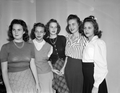 Five girls are pictured here. These girls recently were elected officers of Captain William Scott Society, Children of the American Revolution. Standing side by side in a row, from left to right, are Misses Jane Morrison, registrar; Marjorie Moore, president; Margaret Defee, historian; Florence Kent, treasurer; Patsy Buster, secretary. All young women are wearing a combination of skirts, blouses and sweaters. Miss Morrison and Miss Defee are wearing pearl necklaces. Vice president Miss Lucille Hagman has moved to San Antonio, Texas. Published in the Fort Worth Star-Telegram morning edition, October 23, 1941.