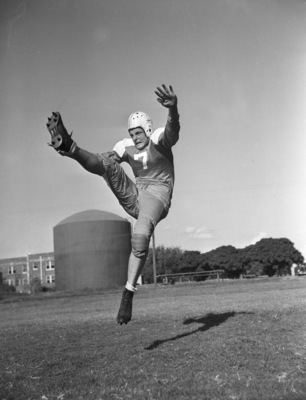 Louis Burress is a tailback on the Masonic Home High School football team. He is a triple threat player with the ability to run, pass, and punt. The lanky Mason has been nursing bruises all week in practice, but is expected to play a standout game against Amon Carter-Riverside High School. Burress is shown in practice, just after releasing a punt from his right foot. He is wearing a number 7 football uniform and a helmet. The high school and a cistern are in the background. "--Star-Telegram Photo." Published Star-Telegram Eve. Oct. 17, 1941.