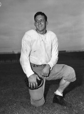 Phil Roach is one of the Co-Captains of the Texas Christian University football team. Roach is also one of the conference's outstanding ends. He is a graduate from Polytechnic High School in Fort Worth, Texas. The 1941 season will be his fourth as a regular player. Roach is shown in a kneeling pose on the field, dressed in a practice uniform. Published in the Fort Worth Star-Telegram evening edition, October 17, 1941.