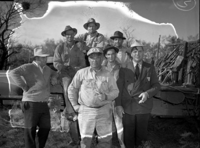 Knight, P. J.; Burrows, Walt; Knight, J. C.; Ewing, G. W.; Peach, A. A.; Hamrich, J. T.; Smith, R. M.; Stephens County Oil Play Revival; workers; Sweaters; Suspenders; Cigarettes; Pipes (Smoking); Tractors
