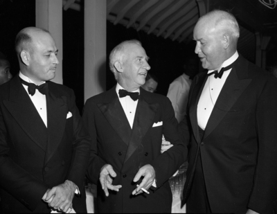 Interstate Oil Compact Commission Meeting attendees Major P. K. Porch, Camp Wolters, and Colonel Henry C. McLean, right, temporary commanding officer of Camp Wolters, shown talking to John E. Farrell, Fort Worth, Texas. Published in The Fort Worth Star-Telegram Morning Edition October 17, 1941.