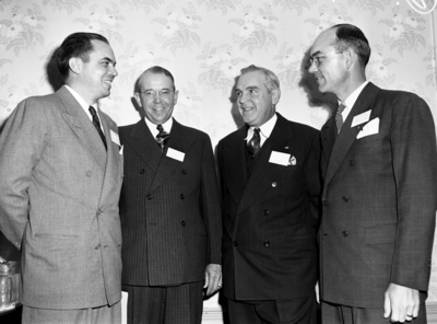 Texas Safety Association regional traffic safety conference attendees (left to right) George Clarke, Austin, Texas; O. P. Dodson, mayor of Decatur, Texas; J. Clyde Jones, Fort Worth, Texas; and State Senator Vernon Lemens of Waxahachie, Texas. The conference was held at the Hotel Texas. Published in The Fort Worth Star-Telegram Evening Edition October 16, 1941.