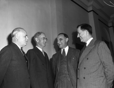 Four of the conferees who gathered here Thursday to try to pave the way to agreement on joint sponsorship by Fort Worth, Dallas, and Arlington of a midway airport. Left to right, A. A. Lund; W. F. Altman; Colonel Lucius Clay and Paul Carrington. All the men are seen to be wearing suits. Published in The Fort Worth Star-Telegram Evening Edition October 16, 1941.