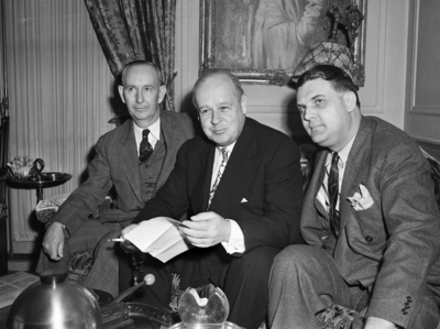 Postmaster General Frank C. Walker came to Fort Worth Friday on an official inspection trip, to launch a new defense bond and savings stamp campaign and witness the Texas Christian University (TCU) and Agricultural and Mechanical College of Texas (Texas A&M) football game. He is show with his Texas hosts, Postmaster Burris C. Jackson of Hillsboro, Texas (right) and Postmaster Henry D. Young of Fort Worth, Texas (left). This is the Postmaster General Walker's first trip to Texas. Postmaster Walker is sitting on a couch in between the two Texas postmasters. Mr. Walker is holding a cigarette in his right hand and a piece of paper in his left hand. All three men are wearing suits. There is a painting on the wall and drapes covering a window behind the men. Star-Telegram Morning Edition October 18, 1941