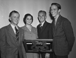 Officers of the 75-voice young people's choir of Rosen Heights Baptist Church include, left to right, Arthur Brewer (vice president), Miss Mable Sutherland (secretary-treasurer), Truett Walton (president) and Bill Wright (social chairman). The officers are standing in front of a blank wall. In the foreground is a music stand. The three men are dressed in suits and Miss Sutherland is wearing a floral print dress.