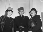 The Fort Worth Garden Club is hosting a one lesson course in flower show arrangements. The class is conducted by Miss Anne B. Wertsner of Philadelphia, Pennsylvania. Several out-of-town visitors attending the class. Among them are three women from Wichita Falls, Texas. They are, left to right, Mrs. Peyton Gwynne, Mrs. C. E. E. McCutchen, and Mrs. Lucian Wright. Mrs. Gwynne is wearing a hat, blazer, fur shawl, and a skirt. Mrs. McCutchen is dressed in a hat, a coat belted at the waist, and a brooch. Mrs. Wright is wearing a hat, blouse, skirt, coat, and brooch. Her purse is tucked under her arm.
