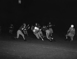 A football game between the Masonic Home High School and North Side High School is being held at Farrington Field in Fort Worth, Texas. The Masons are shown with the ball while the Steers (dark jerseys with striped sleeves) are on defense. Mason tailback Louis Burress (7) is shown carrying the ball. He is dipping between potential Steer tacklers. One of the Steers in pursuit is Twain Morrow (61).