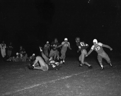 A football game between the Masonic Home High School and North Side High School is being held at Farrington Field in Fort Worth, Texas. The Steers are wearing dark jerseys with striped sleeves while the Masons are in the two-toned jerseys. Two Steers, numbers 58 and 52, are shown in the grass after tackling a Mason runner. Approaching the play on the right is Mason guard Cecil Moseley (25) and Steer defender Twain Morrow (61). The Masons team is always referred to locally as the "Mighty Mites."