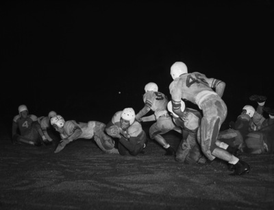 A high school football game between the Masonic Home Masons and the Amon Carter Riverside Eagles (white jerseys) is being held at Farrington Field in Fort Worth, Texas. In the third quarter of the game, Mason All-State fullback Gordy Brown (43) got the call. He is shown diving into the end zone at the one-yard line. The play went for the Mason's first score of the game. The Eagle at the right attempting to make a tackle is Dave Miller (50). The Masons continued the comeback, and went on to win 12-7. "(Star-Telegram Photos by Tommy Dillard.)" Published Star-Telegram Morn. Oct. 18, 1941.