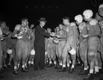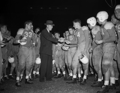 The Masonic Home High School football team is in a huddle before a game at Farrington Field in Fort Worth, Texas. They are facing the Amon Carter Riverside Eagles. Coach H. N. "Rusty" Russell is shown talking to his team prior to the start of the game. Coach Russell is dressed in a hat and a double breasted suit. Some of the players in the huddle are wing back Billy Joe Cagle (33) and tackle Floyd Lewis (6). "Though often out-weighed by their opponents, the Mighty Mites are one of the toughest football teams in Texas."