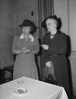 The Fourth Annual Goodfellow Ball will be held on November 29 at the Hotel Texas. The event is being sponsored by the Business and Professional Women's Club. Discussing preparations, left to right, are Miss Virginia Alice Williams and Mrs. John G. Sims Junior. They are chairman and co-chairman, respectively, of the Goodfellow Bridge Committee. They are shown studying table arrangements in the Alamo Room of the Hotel Texas. Miss Williams is dressed in a hat, button-up blouse, and a skirt. Mrs. Sims is wearing a hat, polka-dot dress and a butterfly brooch.