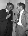Thousands of football fans are arriving in Fort Worth, Texas to attend the Saturday football game. The Texas Christian University Horned Frogs are hosting the visiting Texas A&M Aggies at Amon G. Carter Stadium. Friday night, before the game, the Aggies hosted an A&M ex-students rally at the Hotel Texas. In attendance are Taylor Wilkins and Jim Thomason. Mr. Wilkins finished his football career as an Aggie in 1935. He is shown smoking a cigarette, and dressed in a three-piece suit. Mr. Thomason was a great blocking back for the Aggies during their banner years of 1939 and 1940. He is wearing a tweed suit. Published in The Fort Worth Star-Telegram morning edition, October 18, 1941.