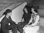 Thousands of football fans are arriving in Fort Worth, Texas to attend the Saturday football game. The Texas Christian University Horned Frogs are hosting the visiting Texas A&M Aggies at Amon G. Carter Stadium. Preparing for the pregame pep rally are left to right Joe Thompson, Miss Frances Gourley, and Miss Georgia Barnes. Mr. Thompson, a Frog yell leader, is giving the girls special instructions. He is dressed in a jumpsuit. Miss Gourley, of Fort Worth, Texas, is wearing a plaid dress. Miss Barnes, of Electra, Texas, is wearing a baseball cap, striped blouse, skirt, and a "Beat A&M" ribbon. They are sitting on the stairs outside the gymnasium. Published in The Fort Worth Star-Telegram morning edition, October 18, 1941.