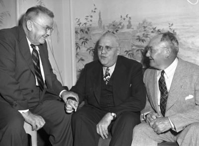 Thousands of football fans are arriving in Fort Worth, Texas to attend the game between the Texas Christian University Horned Frogs and the visiting Texas A&M Aggies at Amon G. Carter Stadium. Friday night before the game, the Aggies hosted an A&M ex-student rally at the Hotel Texas. In attendance left to right are George W. Orms, E. C. Donohue, and T. J. Dwyer. Mr. Orms, of College Station, Texas, is dressed in a suit. Mr. Donohue of El Paso, Texas, graduated from Texas A&M in 1913. He is wearing a three-piece suit. Mr. Dwyer, of Odessa, Texas, is a 1912 graduate. He is wearing a tweed suit. All three men are wearing glasses. Published in The Fort Worth Star-Telegram morning edition, October 18, 1941.