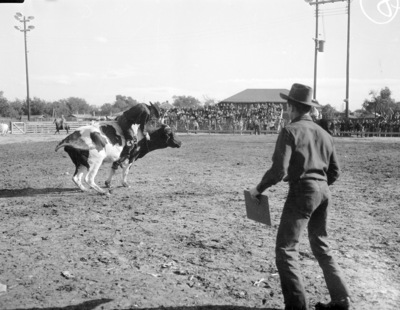 Cowboy Fred Street on a Brahma steer at the Wichita Falls Chuck Wagon Rodeo.