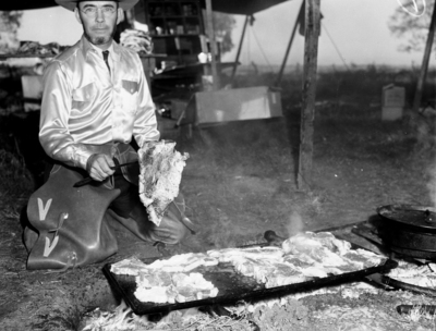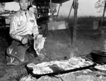 Chuck wagon gang member V. V. Musick, cooking meat at the Wichita Falls Chuck Wagon Rodeo.