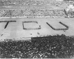 Texas Christian University (T. C. U.) and Texas A&M University football game with band spelling out "Texas Christian University" on field during half time, 10/18/1941