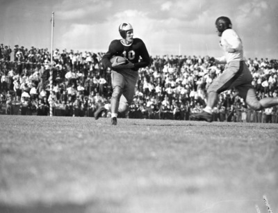 The Texas Christian University Horned Frogs are hosting the visiting Texas A&M Aggies at Amon G. Carter Stadium in Fort Worth, Texas. In the second quarter of the game Frog back Dean Bagley dropped back to throw a pass. The Aggies' Marshall Spivey (number 10) jumped the route and intercepted the pass. Spivey returned the ball seventeen yards to the Aggie forty-seven yard line. Spectators are enjoying the game. Texas A&M won the game 14-0. Published in The Fort Worth Star-Telegram morning edition, October 21, 1941.