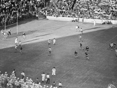 The Texas Christian University Horned Frogs are hosting the visiting Texas A&M Aggies at Amon G. Carter Stadium in Fort Worth, Texas. In the fourth quarter, when shadows fell over the stadium, Aggie tailback Leo Daniels (not pictured) faded back and heaved a pass that hit Harold Cowley (dark jersey 83). Cowley is shown slipping away from the Frog defenders with comparative privacy in the end zone. The pass went for the Aggies second touchdown of the game. On defense for the Frogs are Beecher Montgomery (number 42), Jim Woodfin (number 56), Charley Conway (number 12), and Darrell Palmer (number 71). Spectators are enjoying the game. The Aggies went on to win the game 14-0. Published in The Fort Worth Star-Telegram morning edition, October 19, 1941.