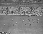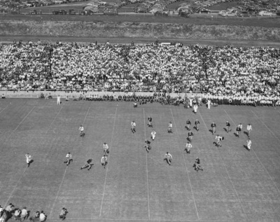 The Texas Christian University Horned Frogs are hosting the visiting Texas A&M Aggies at Amon G. Carter Stadium in Fort Worth, Texas. Disaster plagued the Frogs in the first quarter of the game. Aggie tailback Derace Moser (number 42) is shown lopping sixteen yards to the Frog thirty-seven yard line. Kyle Gillespie (number 40, extreme left) attempted to make a tackle when an Aggie blocker clipped him. The Frogs' backfield ace suffered a serious leg injury and was removed from the game. The clipping penalty was called against the Aggies and backed them up to their forty-three yard line. Other Texas Christian University (T. C. U.) defenders on the field are Frank Kring (number 30), Nolan Sparks (number 24), Frank Medanich (number 10), and Jack Odle (number 54), Bill Crawford (number 61), Phil Roach (number 80), Mike Harter (number 62), Darrell Palmer (number 71), and Bruce Alford (number 83). The Aggie blockers are Jim Sterling (number 81) and Dickey (number 82). Spectators are enjoying the game. Texas A&M went on to win 14-0. Published in The Fort Worth Star-Telegram morning edition, October 19, 1941.