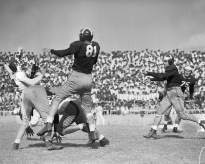 The Texas Christian University Horned Frogs are hosting the visiting Texas A&M Aggies at Amon G. Carter Stadium in Fort Worth, Texas. In the first quarter, the Frogs were backed up on their six-yard line and Kyle Gillespie (40 white jersey) attempted to punt the ball away. Aggie end Jim Sterling (81) and tackle Martin Ruby busted through the line and managed to block the punt. Sterling is shown as the ball bounced off his chest. Ruby is bending over the back of Frog, Frank Kring (30). The Aggies converted the block into a touchdown a few plays later. They won the game 14-0. Large spectators are enjoying the game. Published in The Fort Worth Star-Telegram morning edition, October 19, 1941.