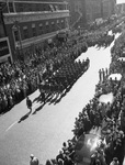 Before the football game between the Texas Christian University Horned Frogs and the Texas A&M Aggies, a parade swept through downtown Fort Worth, Texas. Spectators are lining both sides of the street as the procession travels down Main Street. A&M Cadets are marching in lines of six. They are passing the Milner Hotel, A. Davis Company, and the Texas Coffee Shop.