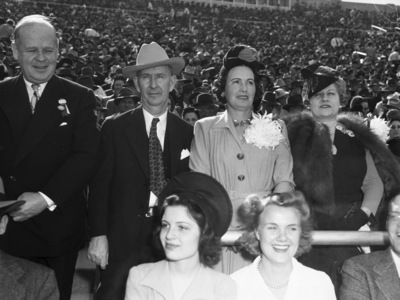 The Texas Christian University Horned Frogs are hosting the visiting Texas A&M Aggies at Amon G. Carter Stadium in Fort Worth, Texas. Thousands of football fans traveled from all over the nation to catch the much anticipated game. Attending the game left to right are Postmaster General Frank C. Walker, Postmaster Henry D. Young, Mrs. Young and Mrs. Walker. Postmaster General Walker is one of the dignitaries at the game. He is visiting from Pennsylvania. He is dressed in a double breasted suit. Postmaster Young is dressed in a cowboy hat and a suit. Mrs. Young is wearing a hat, button-up dress, and a corsage. Mrs. Walker is wearing a hat, dress, pearl necklace, brooch, fur coat, and gloves. Published in The Fort Worth Star-Telegram morning edition, October 19, 1941.